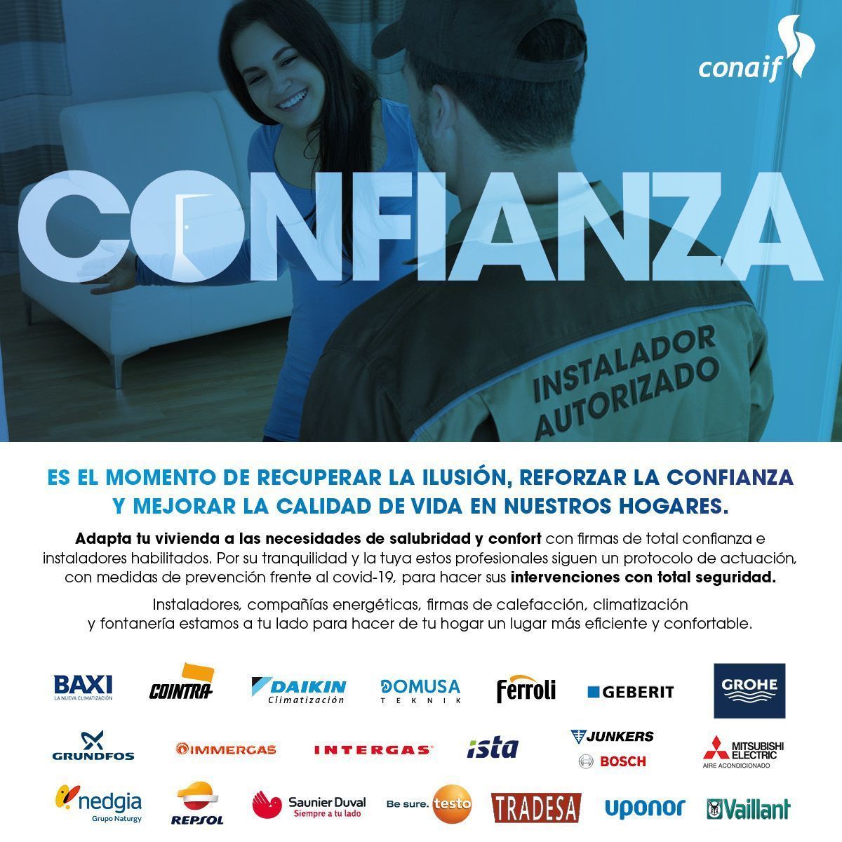 La Confederación Nacional de Asociaciones de Instaladores y Fluidos, Conaif, ha puesto en marcha, en colaboración con una veintena de firmas de calefacción, climatización, agua y del sector energético, una campaña enfocada a reactivar el sector de las instalaciones. El objetivo que persigue es doble: por una parte vencer el recelo que, por motivo del coronavirus, el usuario pudiera tener a la entrada en su hogar de profesionales para acometer alguna instalación u operación de mantenimiento de instalaciones y, por otra parte, transmitirle que es el momento idóneo para que inicie en su hogar la reforma de instalaciones proyectada o que dejó pendiente con la llegada de la crisis sanitaria.