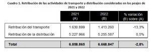 Los peajes de acceso se han determinado teniendo en cuenta la estimación de la retribución del transporte y la distribución que resulta de aplicar la Circular 5/2019 y la Circular 6/2019. En particular, la parte de la retribución del transporte considerada en el cálculo de los peajes para el ejercicio 2022 es un 13,3 % inferior a la considerada en el cálculo de los peajes del ejercicio 2021. Por su parte, la retribución considerada en el cálculo de los peajes de distribución es un 0,5% superior a la considerada en el cálculo de los peajes del ejercicio 2021.
