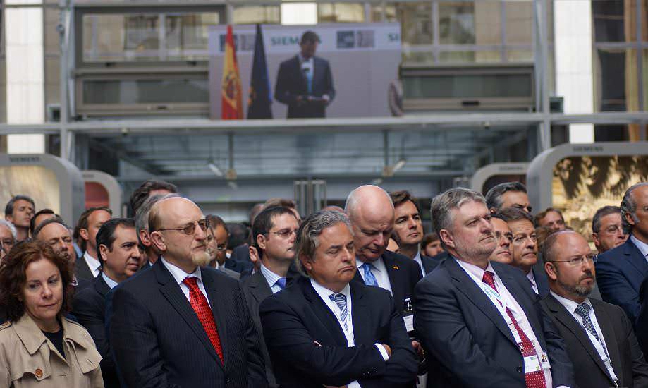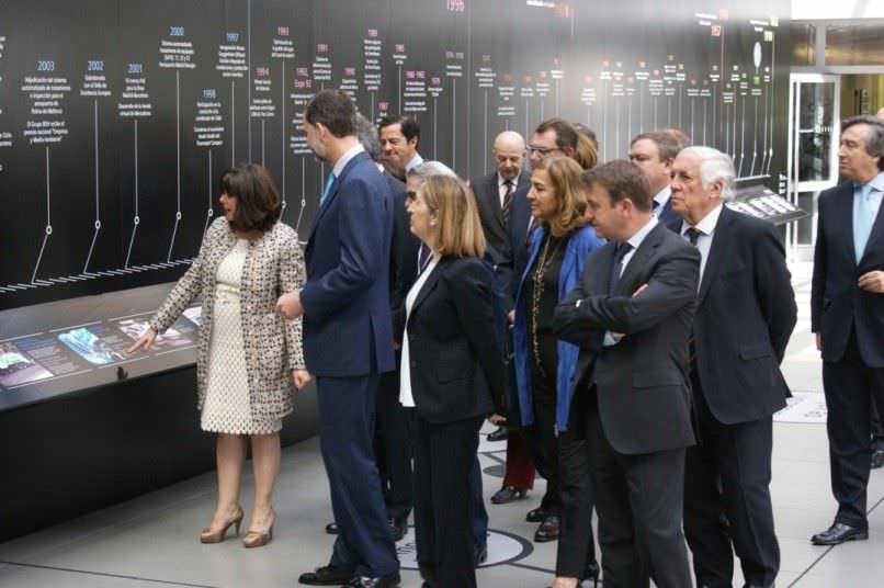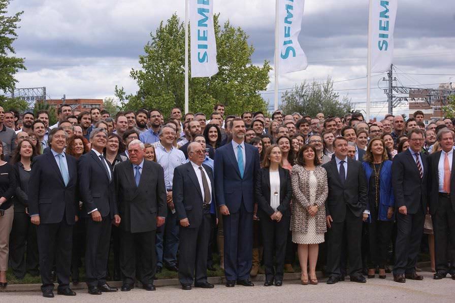 Un momento del acto de inauguraciónEl acto contó con la presencia del Rey de España, Felipe VI, que descubrió una placa conmemorativa de la efeméride, después de efectuar un recorrido por las nuevas instalaciones, así como por el showroom instalado en la parte trasera de hall de la sede de Siemens en Tres Cantos, en Madrid. En este último pudo conocer someramente algunos detalles sobre la historia de la empresa en España a lo largo de estos 120 años, de la mano de su presidenta, Rosa García, y en compañía de la ministra de Fomento, Ana Pastor, y del presidente mundial de la compañía, Joe Kaeser.
