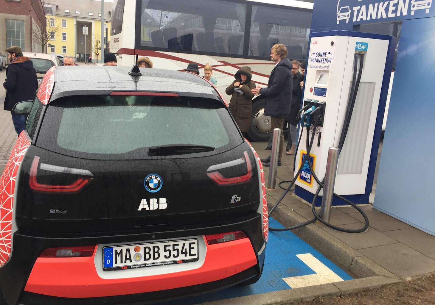 BMW i3 eléctrico cargando energia en la puerta del supermercado ALDI con un cargador rápido tecnología ABB
