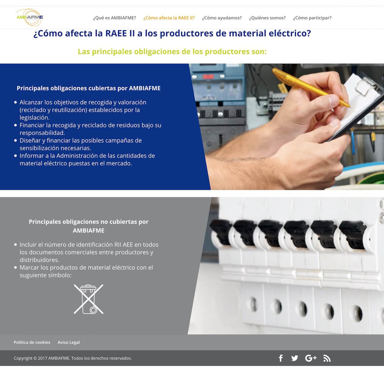 En el portal también se detallan todos esos productos afectados, clasificados en 6 familias: aparamenta y equipos para uso industrial y análogos; máquinas eléctricas y similares; dispositivos de protección para uso doméstico y análogos; pequeño material eléctrico; automatización, gestión técnica de la energía y seguridad para viviendas y edificios; y otros equipos. Además se explica cómo afecta el RD y cuáles son las principales obligaciones que Ambiafme cubre: alcanzar los objetivos de recogida y valoración (reciclado y reutilización) establecidos por la legislación; financiar la recogida y reciclado de residuos bajo su responsabilidad; diseñar y financiar las posibles campañas de sensibilización necesarias; e informar a la Administración de las cantidades de material eléctrico puestas en el mercado. Así como también aquellas de las que la organización no se ocupa: incluir el número de identificación RII AEE en todos los documentos comerciales entre productores y distribuidores; y marcar los productos de material eléctrico con el símbolo del reciclaje.