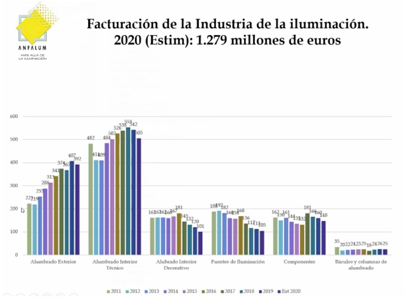 La asamblea general de la Asociación Española de Fabricantes de Iluminación ofreció el pasado jueves las cifras concluyentes del sector respecto del año que se cierra marcado por la pandemia y los sucesivos confinamientos. La industria de la iluminación cierra 2020 con un descenso del 6,7 % de facturación, lo que supone que la facturación anual se ha situado en 1.279 millones de euros, de los que 759 millones corresponden a ventas en el mercado nacional y 520 millones a ventas en mercados exteriores.