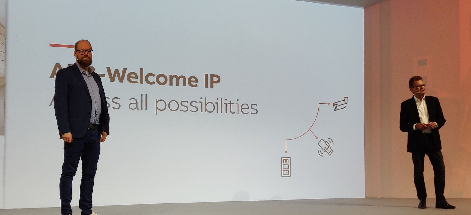 Alexander Grams y Adalbert Neumann durante la exposición de IFA 2019 ABBA continuación tuvo lugar la presentación del System Access Point 2.0, que amplía y mejora las capacidades de conectividad del sistema free@home, llegando a un máximo de 150 dispositivos conectados de forma inalámbrica o por cable, combinados como sea necesario para un mejor servicio al cliente. El videoportero Welcome fue otra de las novedades, ahora la tecnología IP, para multiplicar de forma casi infinita el número de unidades a utilizar en un conjunto de edificios, con una mejora de la conectividad con el hogar y un mantenimiento simplificado.