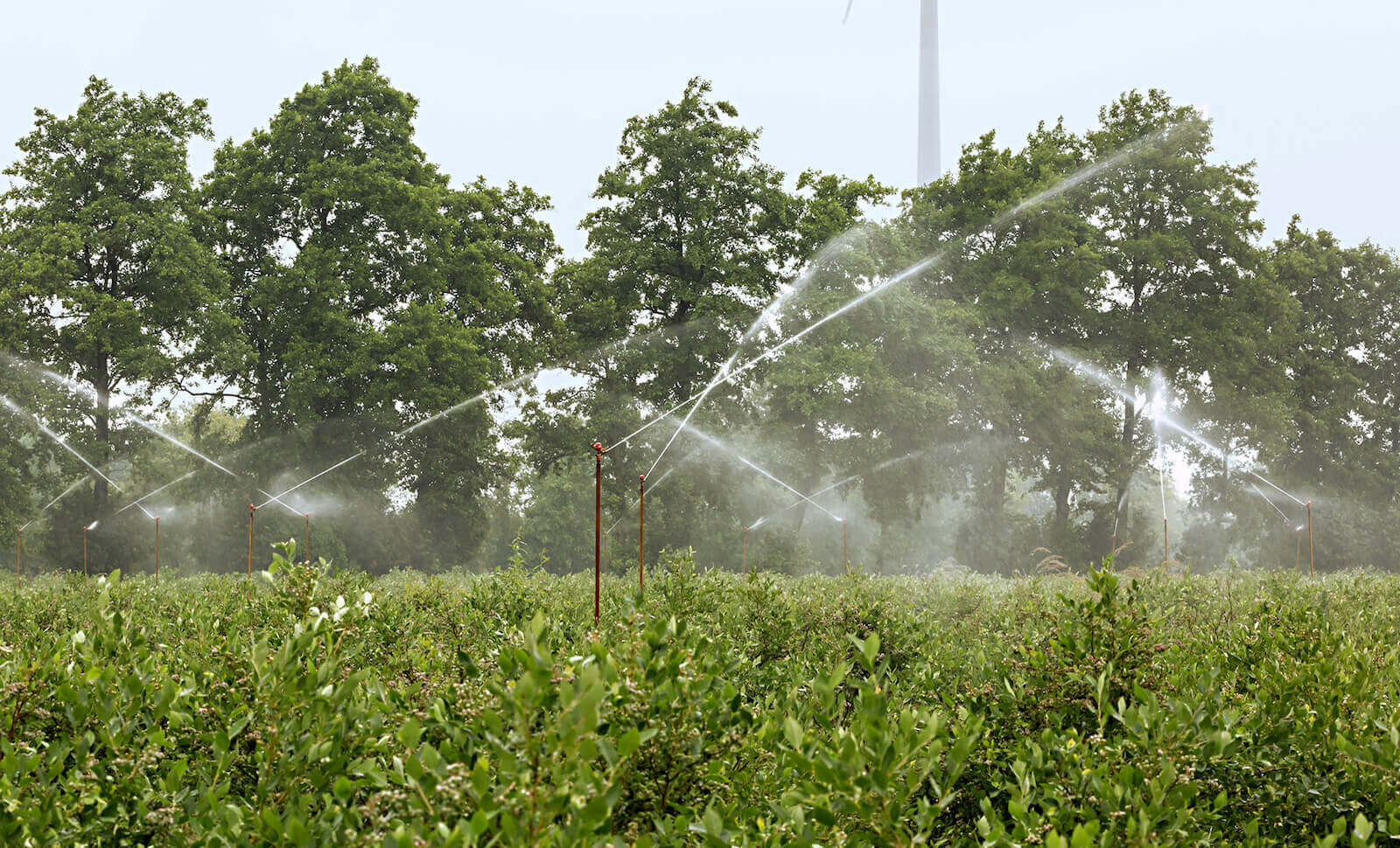 Para contrarrestar cualquier caída repentina de temperatura y evitar los daños ocasionados por las heladas, Thiermann ha instalado varios centenares de aspersores de agua en sus huertos de arándanos. Los aspersores rocían las cimas de los arbustos con agua para evitar que la fruta se congele. Su activación depende de lo avanzado del fruto. Si los capullos siguen cerrados, se activan a los 0,5 °C. Si están abiertos, la activación de las bombas se realiza cuando la temperatura alcanza el punto de congelación. Este método de protección se basa en las propiedades físicas del agua. Cuando el agua transita del estado líquido al estado sólido agregado, se crea calor.