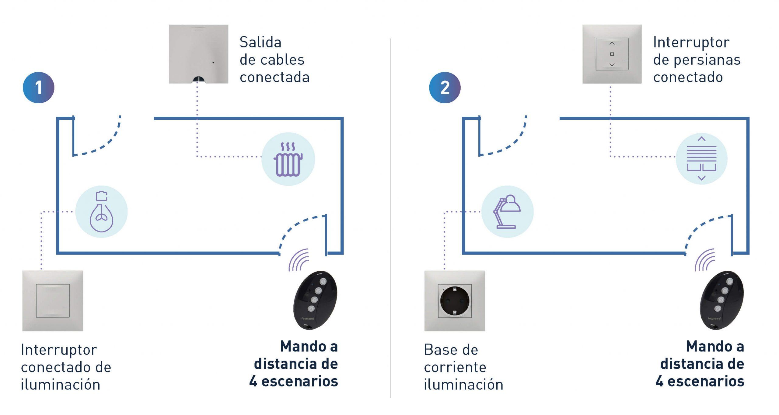 De la misma forma que su predecesor, el comando inalámbrico 4 escenarios de pared, este nuevo dispositivo controla a distancia agrupaciones de varios dispositivos conectados y definidos como un escenario, entre interruptores (con opción regulación), micromódulos de iluminación, bases de corriente y salidas de cable conectadas e interruptores y micromódulos de persianas. Además permite asociar hasta 4 escenarios a los pulsadores del mando, gracias a la APP Home + Control Legrand, disponible para iOS y Android.