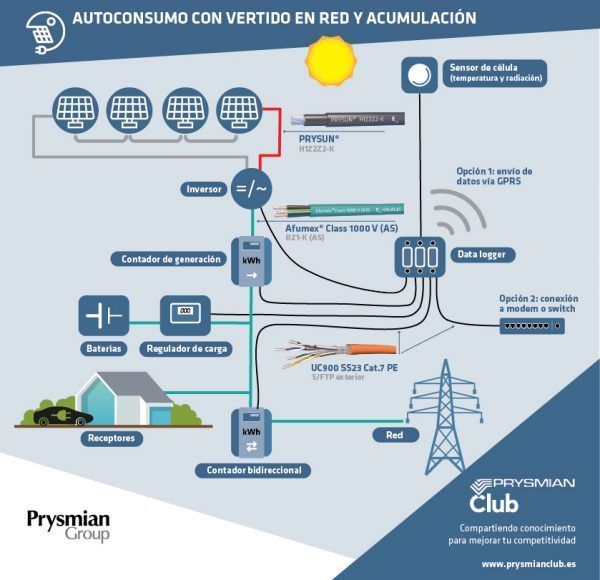 Esquema de aplicación de cables de energía y comunicaciones a un sistema fotovoltaico para autoconsumo con posibilidad de vertido en red. El cable Prysun® está destinado al lado de corriente continua. Hay varias opciones para el vertido de energía autoproducida a la red, pero todas deben realizarse según norma.
