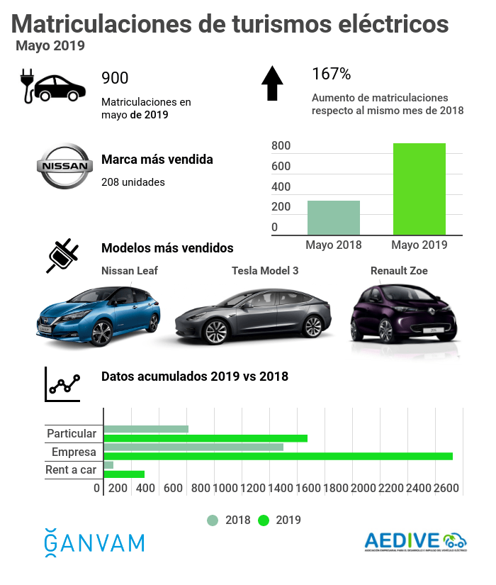Todos los canales aumentaron significativamente sus registros de ventas con respecto al mismo mes de 2018. Así, el de empresas matriculó 505 unidades en mayo de 2019 (+120%), particulares 303, (+315% siendo el que más crece) y alquilador 92 (+171%).