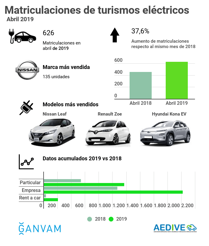 Los vehículos eléctricos registraron un total de 626 matriculaciones en abril de este año, un 37,6% más respecto al mismo mes del año anterior. Además, en lo que va de año se han matriculado un total de 3.385 turismos eléctricos puros, lo que implica un 106% más que el año anterior, según los datos facilitados por Aedive y Ganvam. En este primer cuatrimestre se registra un crecimiento de más del 89% en turismos cien por cien eléctricos (BEV), mientras que los vehículos híbridos enchufables han visto crecer sus ventas en 2019 un 84%. En concreto, estos últimos han sumado 665 matriculaciones en abril y 2.390 en lo que va de 2019.