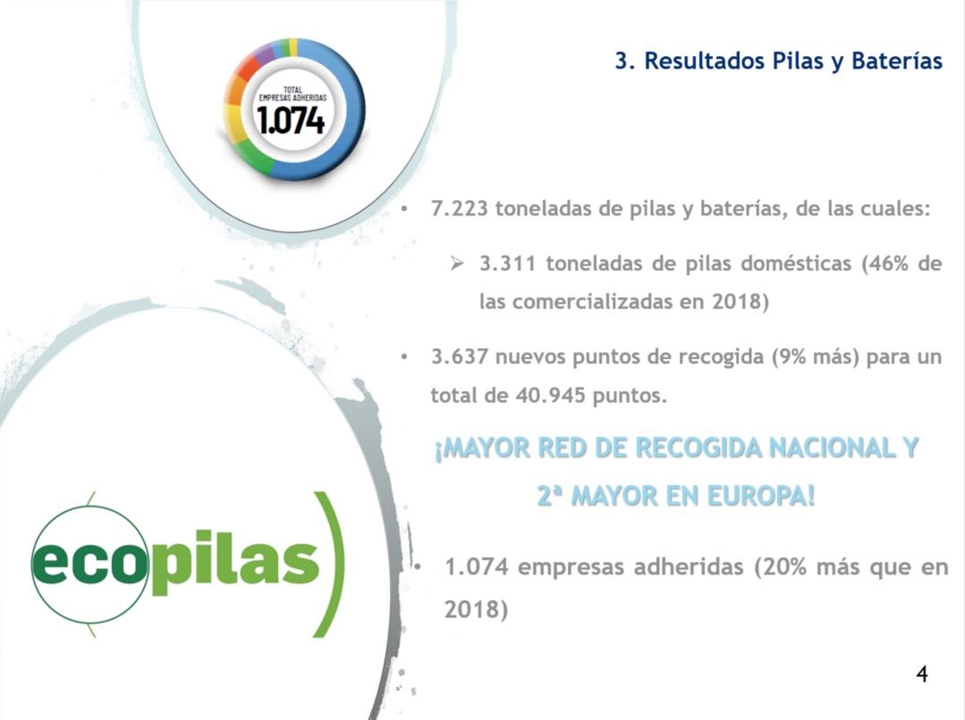 En relación con las pilas y baterías de todo tipo -portátiles, industriales y de automoción-, en 2019 Ecopilas gestionó 7.223 toneladas, un 16 % más que en el año anterior. De este volumen, 3.311 toneladas corresponden a pilas domésticas, el equivalente al 46 % de las comercializadas el año pasado, por encima del índice de recogida obligatorio establecido por la normativa para el pasado año. Además desplegó 3.637 nuevos puntos de recogida, un 9 % más que en 2018, hasta alcanzar los 40.945, la red más amplia en España y la segunda en Europa, sólo por detrás de Alemania. También ha crecido Ecopilas un 20 % en empresas adheridas, hasta superar el millar y situarse en 1.074.