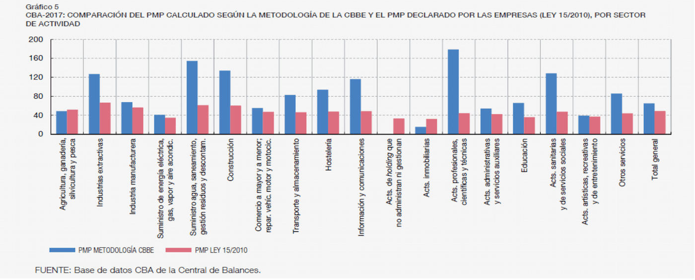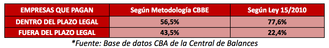 La PMcM ha aprovechado también para contrastar las cifras de su informe con los datos recogidos por la Central de Balances del Banco de España relativos al mismo periodo anual y detecta también “un desfase entre el plazo en el que las empresas dicen que pagan y en el que realmente lo hacen”. La Ley 15/2010, que la propia Plataforma impulsó, obliga a las empresas a informar de sus periodos medios de pago a proveedores en sus cuentas anuales. De este modo, el 77,6% de las propias compañías declaran pagar en el plazo legal, pero sólo el 56,5% lo hace. Al contrario, sólo el 22,4% confiesan no hacerlo en sus balances, pero las cifras oficiales llevan el porcentaje al 43,5%. Según la PMcM, una razón que lo justificara podría ser que en la fórmula empleada para los balances por las compañías «no se considera al confirming como deuda comercial pendiente de pago».